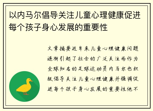 综上所述,内马尔对儿童心理健康的关注,既是他个人成长的经历所带来的反思,也是他作为公众人物对社会责任的担当。他通过个人影响力,积极倡导社会关注儿童心理健康,推动了家庭、学校、社会等各方对孩子身心健康的重视。每个孩子都应该在一个充满关爱的环境中成长,而这种环境需要社会各界的共同努力来构建。